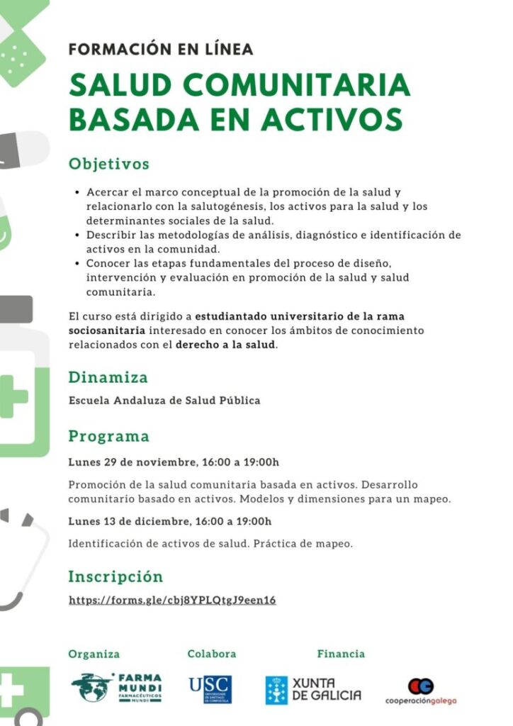 Desde Farmamundi y la facultad de Farmacia de la Universidad de Santiago de Compostela hemos organizado la formación virtual titulada La Salud Comunitaria basada en Activos: cómo mapear activos de salud para el bienestar comunitario, que tendrá lugar los próximos días 29 de noviembre y 13 de diciembre, de 16:00 a 19:00 horas, a través de la plataforma Zoom.
