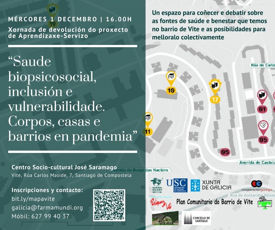 Desde Farmamundi, el Plan socio-comunitario de Vite, Vite en Rede y la Universidad de Santiago de Compostela (USC), organizamos el 1 de diciembre la jornada de devolución del proyecto de Aprendizaje-Servizo “Salud biopsicosocial, inclusión y vulnerabilidad. Corpos, casa y barrios en pandemias”, financiado por la Xunta de Galicia – Cooperación Galega.